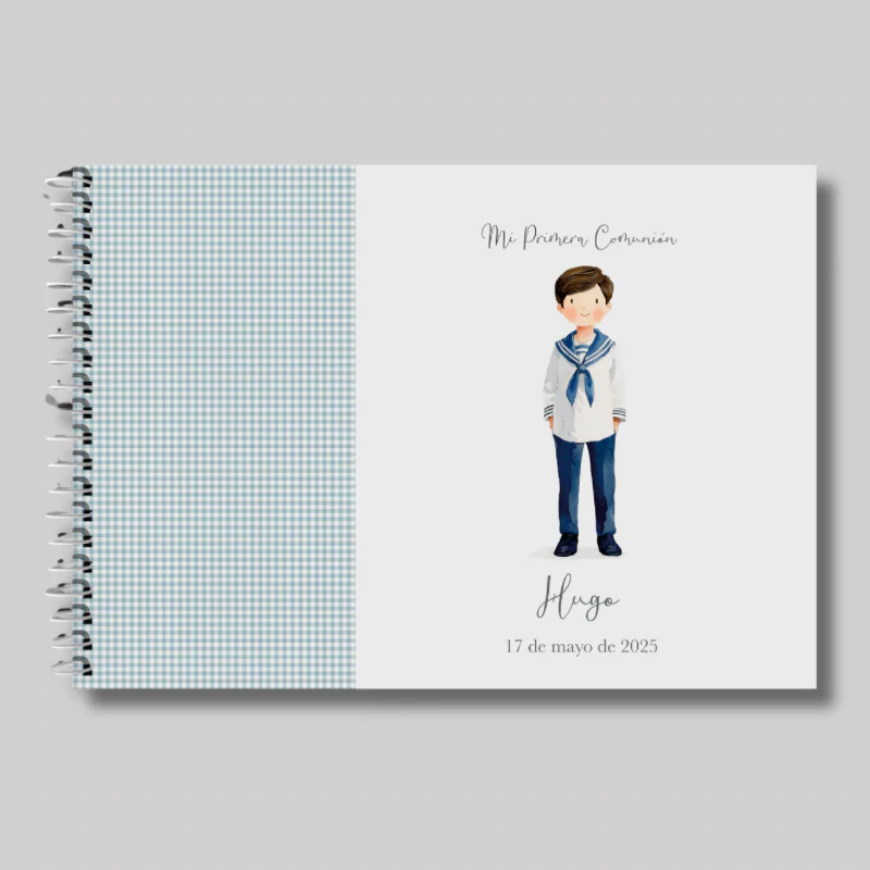 La portada está forrada en papel de alta calidad y se personaliza con el nombre del niño y la fecha de la comunión, combinados con una ilustración en acuarela que define el estilo del diseño.