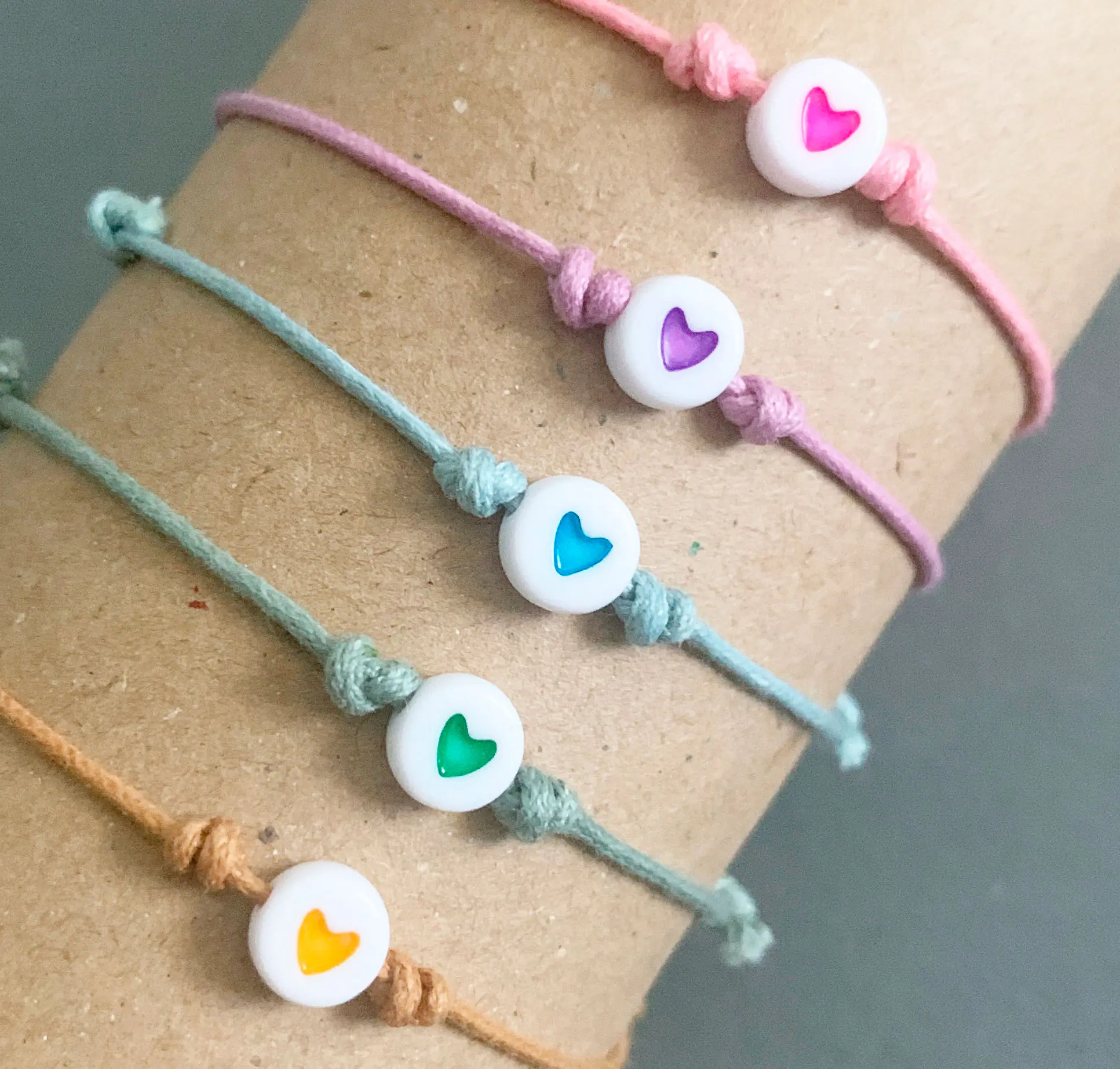 Los colores van surtidos y como se ven en las foto. La pulsera va montada sobre una tarjeta rectangular de 7×11 cm . Las tarjetas van personalizadas con el nombre del niño/a y fecha de la comunión, bautizo o evento. En la galería de imágenes se pueden ver los fondos a elegir. Finalmente todo va dentro de una bolsita de celofán para proteger la pulsera.